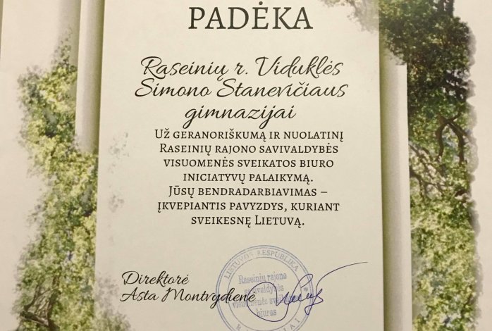 Visuomenės sveikatos biuro 5-mečiui paminėti buvo skirta jubiliejinė konferencija „Augantis visuomenės sveikatos biuras: aktualijos ir idėjų medžioklė šeimos sveikatai stiprinti“. Konferenciją nuotaikingai pradėjome biuro daina - himnu. Sveikinimo žodžius tarė svečiai ir partneriai. Sveikatos apsaugos ministerijos atstovė pristatė visuomenės sveikatos aktualijas, pasidžiaugė, kad 2019 metais bus skirtas didesnis dėmesys ir finansavimas. išklausėme pranešimus, koks sveikatos biurų vaidmuo šeimos sveikatai, kaip tarptautinėje erdvėje, projektų pagalba, galima realizuoti įvairias su sveikata susijusias idėjas. Gerąja patirtimi pasidalino Sveikatos mokymo ir ligų prevencijos centro Vaikų sveikatos skyriaus vedėja, įdomu buvo klausyti apie tai, kokia meno įtaka mūsų sveikatai. Paskutinis pranešimas, kaip „vyšnaitė ant torto“, leido praktiškai išbandyti kaip atpažinti sveikus maisto produktus, kaip juos rinktis parduotuvėse, kaip svarbu skaityti produktų etiketes. Degustavome sveikuoliškus keksiukus ir kokteilius. Raseinių r. savivaldybės visuomenės sveikatos biuro direktorė Asta Montvydienė pasidžiaugė nuoširdžiu ir produktyviu bendradarbiavimu ir ugdymo įstaigom - partnerėm įteikė padėkas ir dovanėles. Mes taip nelikome skolingi ir padėkojome biurui už lektorius, projektus, iniciatyvas, prizus ir daugelį kitų dalykų, kurie padeda mums visose gimnazijos bendruomenės sveikatinimo veiklose.