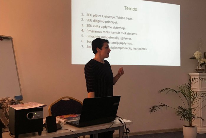 Mokymus vedė Lietuvos socialinio emocinio ugdymo (SEU) asociacijos prezidentė Reda Kunickienė. Kaip sakė Reda, šie trumpi mokymai tai tik įvadas į socialinio emocinio ugdymo supratimą. Prezidentė pristatė SEU plėtrą Lietuvoje, reglamentuojančius dokumentus, diegimo principus. Socialinių emocinių kompetencijų ugdymas vyksta dviem kryptimis: savęs pažinimą ir savikontrolę arba kitų pažinimą ir santykių valdymą. Visi kartu mokėmės atpažinti emocijas, surasti kuo daugiau sinonimų apibūdinančių vieną ar kitą emociją, taip pat atskirti emocijas nuo veiksmų, sekančių po jų proveržio. Smagus šurmulys kilo auditorijoje, kai apie kiekvieną mažos grupelės narį reikėjo išsakyti kuo daugiau gražių žodžių, įvardinti jo gerąsias savybes ir darbus. Pasirodo, nėra lengva klausyti kaip tave giria ir tai natūraliai priimti, kaip ir nelengva kalbant apie kitą asmenį, neatsigręžti į save, į palyginimus ar pamokymus. Socialinis emocinis ugdymas - viena iš gimnazijos 2019 metų prioritetinių veiklos krypčių, tad tokie mokymai tik sustiprina mūsų pasirinkimą.