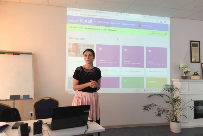 Birželio 26 d. gimnazijoje lankėsi „Šviesos“ leidyklos atstovė Rūta Žemaitienė. Viešnia mokytojus supažindino su EDUKA klasės naujovėmis, pristatė naudojimosi šia skaitmenine edukacijos laboratorija galimybes. Pritariame išsakytai minčiai, kad mokymasis, kaip jis bevyktų mokykloje, namie, lauke, kelionėje, su knyga ar planšete, telefonu rankoje ar bet kuria kitokia patrauklia forma yra įdomus, prasmingas, įtraukiantis, turiningas ir apdovanojantis procesas. Todėl esame už tai, kad vaikai kasdien eksperimentuotų, tyrinėtų, atrastų, klaustų, gilintųsi, augtų smalsūs ir norėtų tapti savo gyvenimo kūrėjais. Vis dažniau išmanieji įrenginiai, virtualios erdvės tampa neatsiejama pamokos dalimi, praturtinančia ugdymo procesą ir motyvuojančia mokinius.