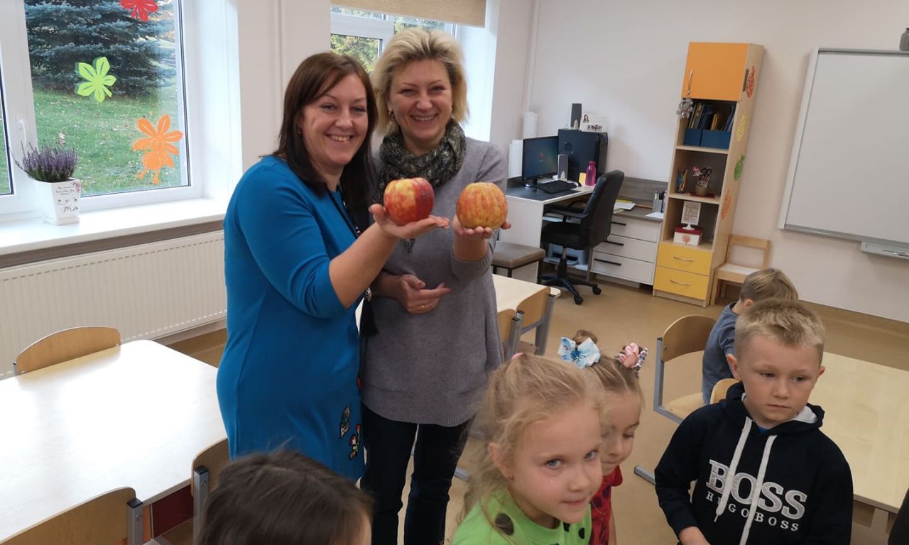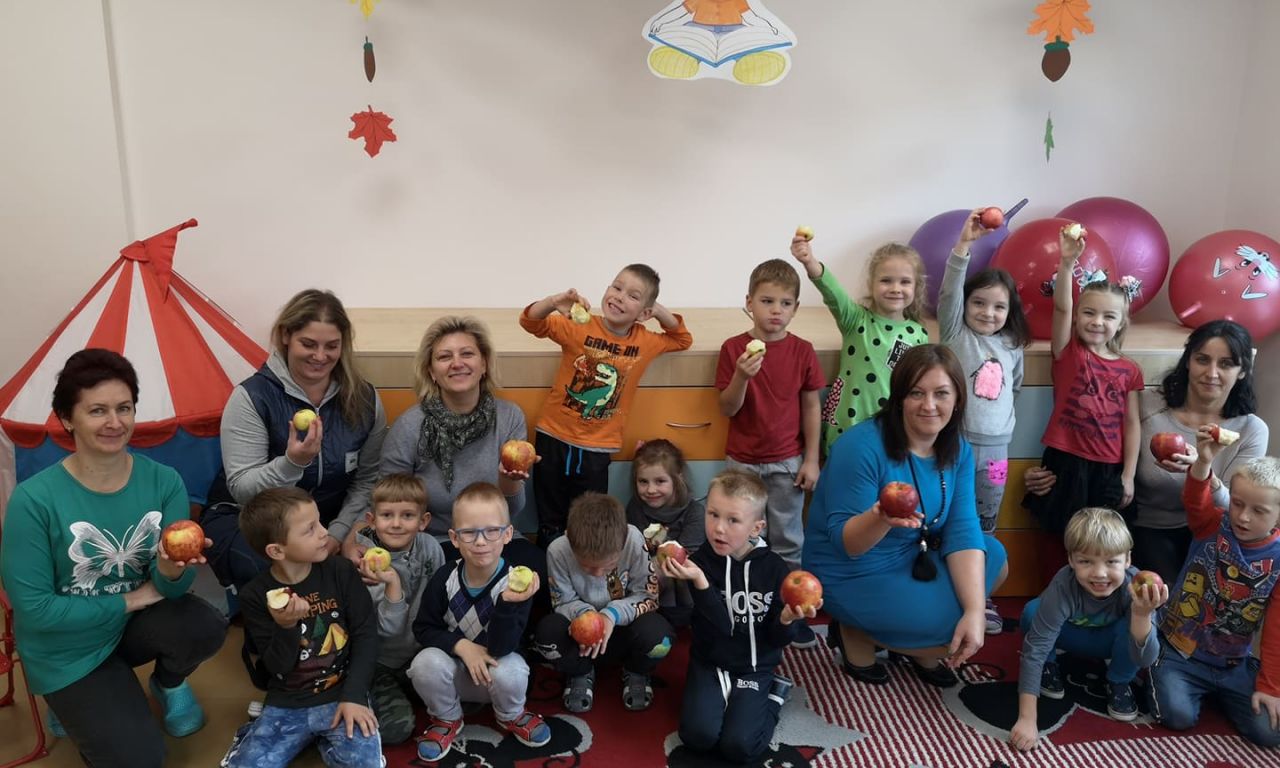 PUG vaikai, kartu su socialine pedagoge Romena ir praktikante Giedre kalbėjosi apie obuolių naudą, svarbą organizmui, vaikų sveikatai, mokėsi užbaigti patarles apie obuolius (šioje srityje nepakeičiamos buvo grupių mokytojos Ingrida ir Rasa), linkėdami sveikatos dovanojo po obuolį auklytėms Rūtai ir Elenai.