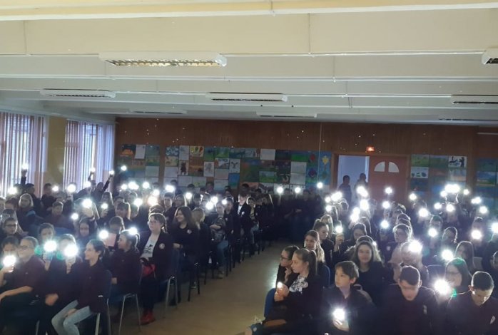 Mūsų mokiniai uždegė telefonų švyturėlius visoms tolerancijos apraiškoms: pabėgėliams, emigrantams, kitataučiams, kito tikėjimo, kitokios dos spalvos, kitaip galvojančiam ar kitaip besielgiančiam žmogui.