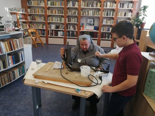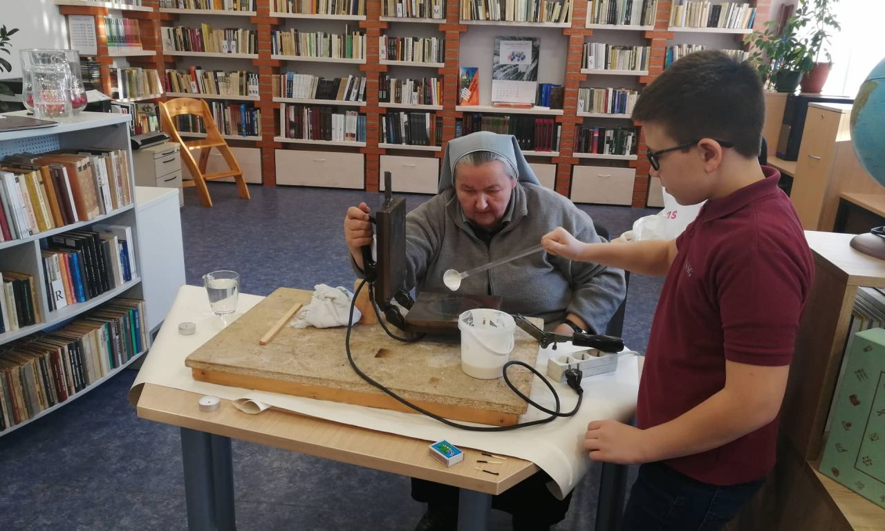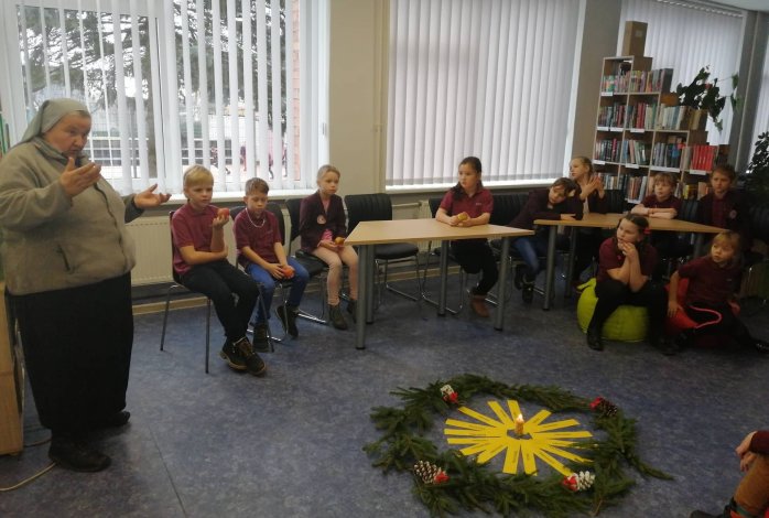Viduklės Simono Stanevičiaus gimnazijoje pirmadienis ypatinga diena. Vyko netradicinės tikybos pamokos pradinių klasių mokiniams gimnazijos bibliotekoje, kurias vedė Šiluvos vienuolyno Eucharistinio Jėzaus seserų kongregacijos vienuolė sesuo Regina Teresiūtė. Sesers vienuolės Reginos mokomi kartu nupynėme advento vainiką. Vėliau susipažinome su Kalėdaičio gimimo istorija. Kūčių stalas neįsivaizduojamas ne tik be 12 patiekalų, bet ir be Kalėdaičio (dar vadinamo plotkele), kuriuo šeima dalijasi Kūčių vakarą. Pamokos metu turėjome galimybę patys išsikepti Kalėdaitį savo Kūčių stalui. Nustebino keptuvės užvožiamo dangčio svoris, nes nepatyrusiam kepėjui prireikia nemažai pastangų. Sesuo vienuolė pasakojo jog šiai keptuvei virš septyniasdešimt metų. Supratome, kad kalėdaičiu dalintis reikia su visais susitaikius, atsiprašius juk Kūčių vakarą atkeliauja Kūdikėlis Jėzus nešantis taiką ir ramybę į kiekvienus namus, į kiekvieno širdį.