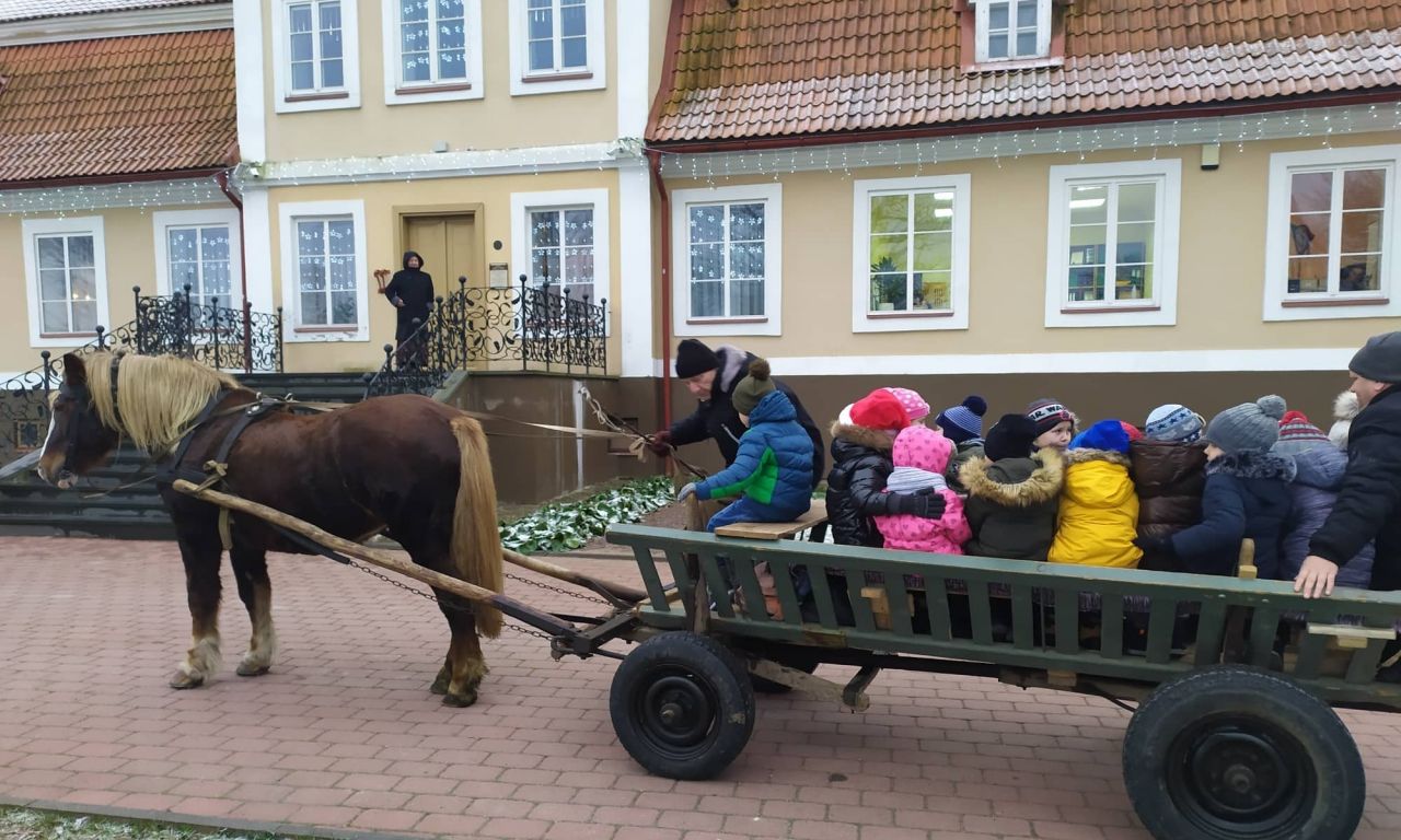 Gruodžio 12 d. priešmokyklinio ugdymo grupių vaikai vyko į Kelmės krašto muziejų susitikti su Kalėdų seneliu. Jo belaukiant, mažieji turėjo įdomią edukaciją su dvaro šeimininkėmis. Jos papasakojo, kokie stebuklai vyksta Kūčių naktį, kokie burtai anksčiau džiugindavo vaikus. Žaidėme žaidimus, būrėmės, traukėme šiaudus, žirnius. Daug įspūdžių sukėlė įneštas gaidys, kuris vaikštinėdamas lesė grūdus iš skirtingų lėkštučių. Taip pat ragavome duonos pyrago su obuoliais. Linksmiausia kelionės dalis buvo pasivažinėjimas arkliu. Po burtų ir stebuklų atėjo laikas susitikti ir su Kalėdų seneliu. Juk kiekvienam vaikui svarbu dovanos. Padainavome dainelę, pašokome su seneliu keletą žaidimų ir sulaukę dovanėlių linksmai sugrįžome į grupes. Džiaugiamės dovanomis ir malonia išvyka.