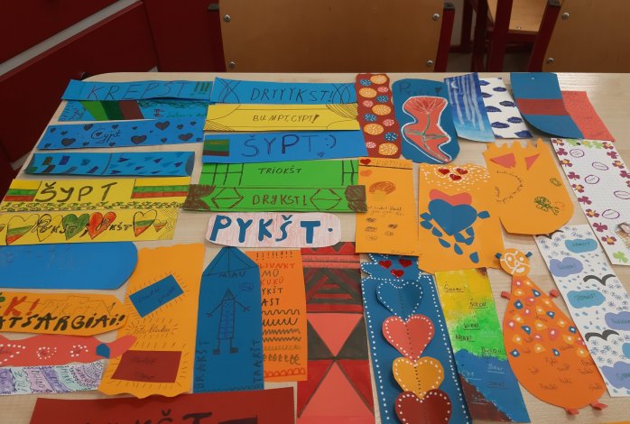 Ir mūsų mokiniai prisidėjo prie gimnazijoje organizuojamų renginių, skirtų lietuvių kalbai. Šią savaitę 5-8 klasių mokiniai gamino knygų skirtukus „Ištiktukas“.