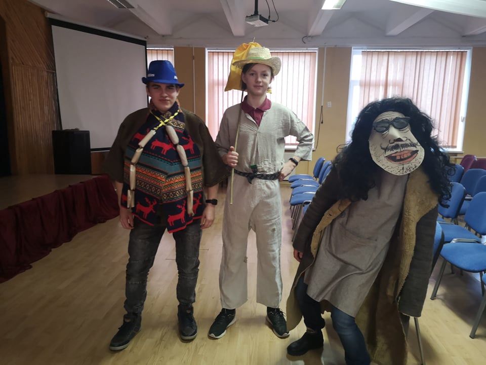 Vasario 25 d. rytmetį visus mokinius ir mokytojus šventiška Užgavėnių nuotaika uždegė įspūdingi pavasario pranašai - žydai ir kiti persirengėliai. Iš pradžių spalvingi čigonai visiems, susirinkusiems pramogų salėje, pristatė, kas yra Užgavėnės, kokie senieji šios šventės papročiai ir tradicijos. Ir netrukus, visų didžiai nuostabai, į salę sugužėjo tikrieji persirengėliai: daktarės, arklys, velniai, žydai, gervė ir, žinoma, Kanapinis su Lašininiu. Jų kova buvo labai kultūringa, atliepianti ir šių metų sezonų panašumą.