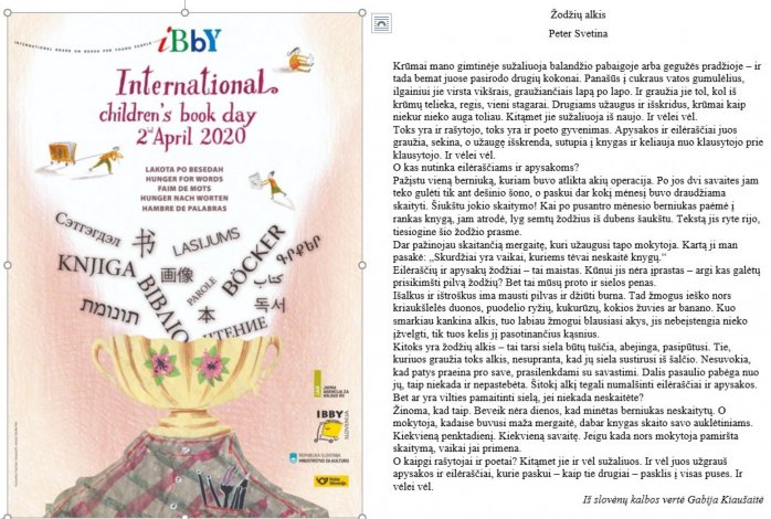 Balandžio 2-oji – žymiojo danų pasakininko Hanso Christiano Anderseno gimimo diena. Nuo 1967 m. pasaulyje ji minima ir kaip Tarptautinė vaikų knygos diena. 2020 m. Vaikų knygos dienos rėmėjas – IBBY Slovėnijos skyrius. Plakatą, o tiksliau – sulankstomą kubą, sukūrė du Hanso Christiano Anderseno premijos nominantai. Teksto autorius – literatūrologas, universiteto docentas ir rašytojas Peteris Svetina, kurio knygos išverstos į aštuonias kalbas, tarp jų – ir į lietuvių. Piešinį nupiešė dailininkas Damijanas Stepančičius.