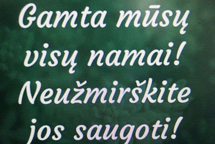 Vakarė, Austėja ir Dominykas siunčia visiems Viduklės Simono Stanevičiaus gimnazijos bendruomenės nariams linkėjimus ir savo sukurtą skrajutę ,, Gamta mūsų visų namai! Neužmirškite jos saugoti!“.