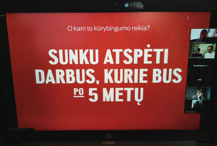 Šiandien didelė gimnazistų dalis dalyvavo „Kūrybingumo mokyklos“ paskaitoje, kurią vedė lektoriai Tomas Ramanauskas ir Kristupas Sabolius. Jų įsitikinimu visas pasaulis alsuoja kūrybingumu, o mokykla ypač. Savo įsitikinimą, kad mokytis yra įdomu, lektoriai patvirtino konkrečiais pavyzdžiais. Kiekvienoje pamokoje galima rasti „perliukų“, kurie žadina smalsumą ir žingeidumą. Pasak A. Damasio, visi mokiniai yra genijai, jei jiems suteikiamas tinkamas išsilavinimas. Mokykla šiuo atveju duoda labai daug, svarbu pasiimti tai, kas pačiam besimokančiam yra svarbiausia. Taigi semkim žinias rieškutėmis ir, kaip patarė lektoriai, „tampykim kūrybingumo raumenį“.