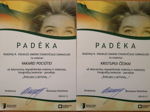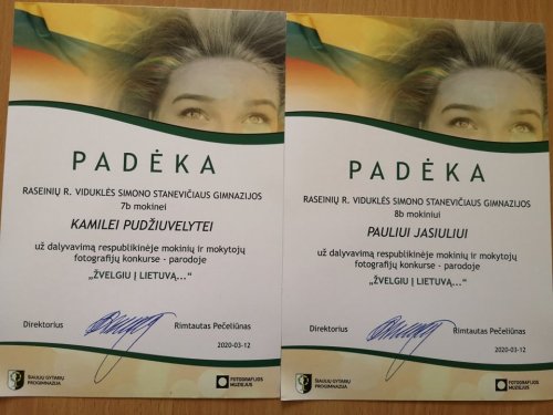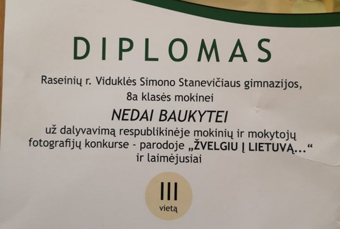 Jau buvau rašiusi, jog penkių mūsų gimnazijos mokinių darbai dalyvavo Respublikinėje mokinių ir mokytojų fotografijų parodoje - konkurse „Žvelgiu į Lietuvą...“. O šiandien mus pasiekė puiki žinia, jog šiame konkurse 5-8 klasių mokinių tarpe 8a klasės mokinė Neda Baukytė užėmė III -ąją vietą! Sveikiname prizininkę ir džiaugiamės kartu!