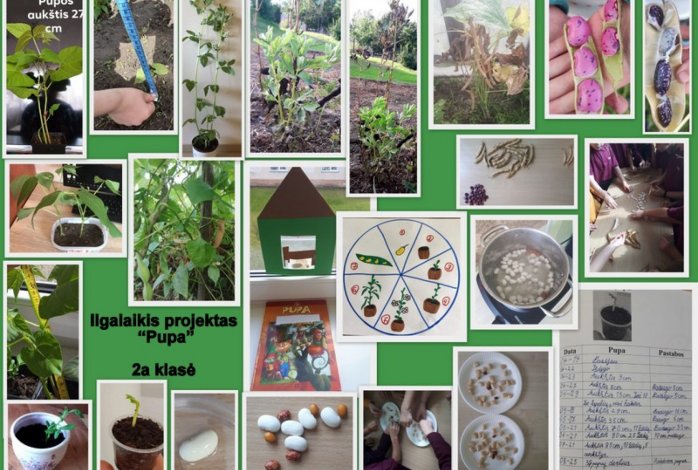 Gimnazijos 2a klasės mokiniai, paskatinti mokytojos, vykdė ilgalaikį projektą „Pupa“ . Ši idėja kilo pirmoje klasėje, kai vaikai perskaitė lietuvių liaudies pasaką „Pupa“. Pasakoje pupa praaugo lovą, lubas ir pasiekė net dangų, todėl visi draugiškai nusprendėme šią hipotezę patikrinti. Pirmiausia, vaikai išsimatavo atstumą nuo grindų iki savo lovos. Tuomet ėmėsi auginti pupą. Kadangi buvo ankstyvas pavasaris, todėl pupą mokinukai pasodino į vazonėlį. Klasėje aptarėme sąlygas, kurių reikia sėklai sudygti bei daigeliui išaugti. Sušilus orams pirmokėliai daigelį persodino į savo namų daržą. Pupos augimo pokyčius fiksavo, fotografavo. Neformalaus švietimo užsiėmimų metu mokiniai džiaugėsi savo augalėlio sparčiu augimu, nes pupa jau buvo pasiekusi lovos dugną. Vaikučiai džiaugėsi sulaukę pirmųjų žiedų ir juos skaičiavo bei fiksavo stebėjimo lapuose. Išsiskyrę vasaros atostogoms sutarė, kad darbą tęs, o rudenį pasidžiaugs derliumi. Rezultatai nustebino, nes kai kurių pupų derlius buvo labai gausus, kitų - kiek kuklesnis. Buvo ir tokių, kurių augalėlis nunyko. Praėjusią savaitę vėl prisiminėme pasaką, paanalizavome duomenis ir sužinojome, kad, deja, hipotezė nepasitvirtino - auginta pupa praaugo tik lovą. Šiuo ilgalaikiu projektu mokiniai sužinojo ne tik apie augalų auginimą, sąlygas, derlių, bet ir suprato, kad pasakos yra sugalvotos. Užaugintas pupas vaikai suvalgė, kitas pasiliko pavasariui, kad vėl galėtų pasėti.