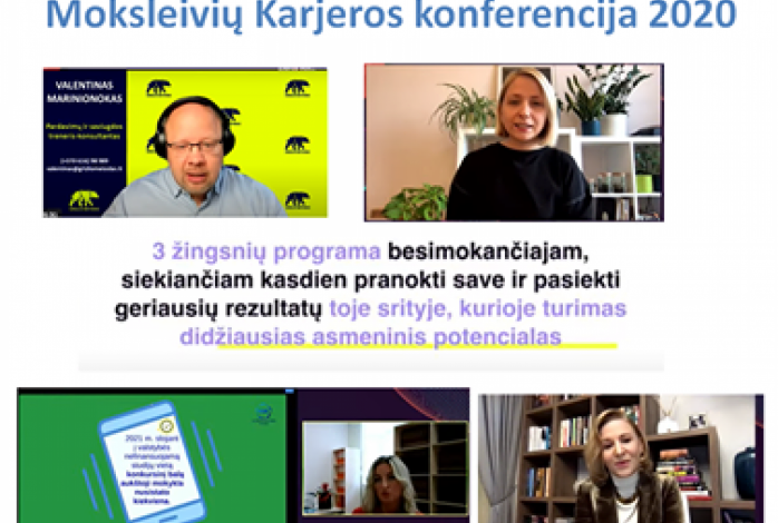 Vyresnių klasių gimnazistai šiandien ryte dalyvavo Karjeros konferencijoje 2020, kurią organizavo Vokietijos ir Baltijos šalių prekybos rūmai bei Vokietijos ambasada Lietuvoje. Jos metu 5 pranešėjai pasidalino savo sėkmės istorijomis bei patarimais. Pasak jų, karjera yra gyvenimo kelionė, kuriai reikia ruoštis dar mokykloje. Trys būtini žingsniai, besimokančiajam, siekiančiam kasdien pranokti save ir pasiekti geriausių rezultatų toje srityje, kurioje turimas didžiausias asmeninis potencialas: 1 – mokymosi tikslo išsikėlimas. 2 – vidinės motyvacijos suradimas ir palaikymas. 3- reguliarus savo progreso stebėjimas ir įsivertinimas. Klausimas nuo ko pradėti? Pradėti svajones pildyti po mažą žingsnelį. Teisingai save užprogramuoti, pavyzdžiui žodžius „mesk kam tau to reikia, nieko neišeis“, suprasti taip „pradėto darbo juk nemesi, įrodyk sau, kad gali tai padaryti“. Supratimas, kad visos veiklos turi prasmę, yra žingsnis sėkmės link.