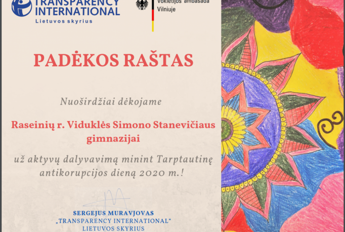 Gruodžio 9 dieną, minint Tarptautinę antikorupcijos dieną mokiniai dalyvavo pamokoje su Jurgiu Didžiuliu. Šioje pamokoje mokiniams suprantama kalba buvo paaiškinta apie korupcijos žalą visuomenei. Džiaugiamės, kad gimnazija gali prisidėti prie šios iniciatyvos.