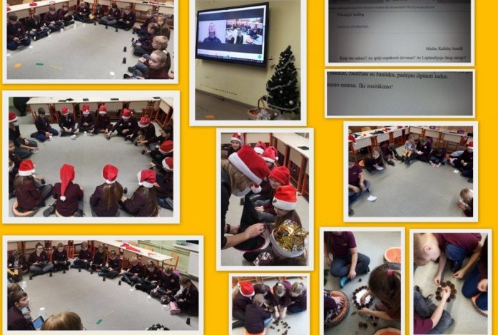 Gruodžio 4 dieną 2a klasėje vyko integruota veikla „Susikurkime šventę“. Rytas klasėje prasidėjo įprastu pasisveikinimu, dienos lūkesčių aptarimu, refleksija. Pagrindinis šios pamokos tikslas – išmokti susikurti šventę sau artimiausioje aplinkoje. Antrokėliai, pasipuošę nykštuko kepurėlėmis, pradėjo kurti šventę. Pirmiausia vaikai aptarė, kokia turi būti šventė, kas jai būdinga, išsiaiškino simbolius, prisiminė tradicijas bei papročius. Kuriamoje šventėje dainavo kalėdines dainas, grojo ,,mušamaisiais“ instrumentais, kuriuos pakeitė vienkartiniai puodeliai. Advento vainiko paslaptis atskleidė tikybos mokytoja Edita. Kalėdinę eglutę antrokėliams padėjo įžiebti gimnazijos direktorė ir socialinė pedagogė. Šventės svečiai palinkėjo prasmingo prieškalėdinio laukimo ir meilės vienas kitam. Mokinukai rašė laišką Kalėdų Seneliui, žaidė popierinėmis sniego gniūžtėmis, kurią sugavę, skubėjo atlikti užduotį.