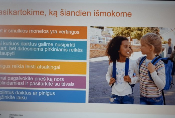 Vasario 9 dieną 2a klasės mokiniai dalyvavo nuotolinėje „Swedbank” Finansų laboratorijos organizuojamoje pamokoje „Susipažinkime su pinigais“. Šią pamoką vedė „Swedbank“ atstovas Justas Klimkevičius. Antrokėliai mokėsi, kaip planuoti savo išlaidas, kaip taupyti nesiskolinant, diskutavo apie gaunamas pajamas ir būdus kaip jas valdyti. Nors mokinukai dar maži, bet labai džiaugėsi, kad finansinio raštingumo žinios padės jiems ateityje priimti finansinius sprendimus, įgyvendinti savo asmeninius tikslus bei siekti svajonių išsipildymo.