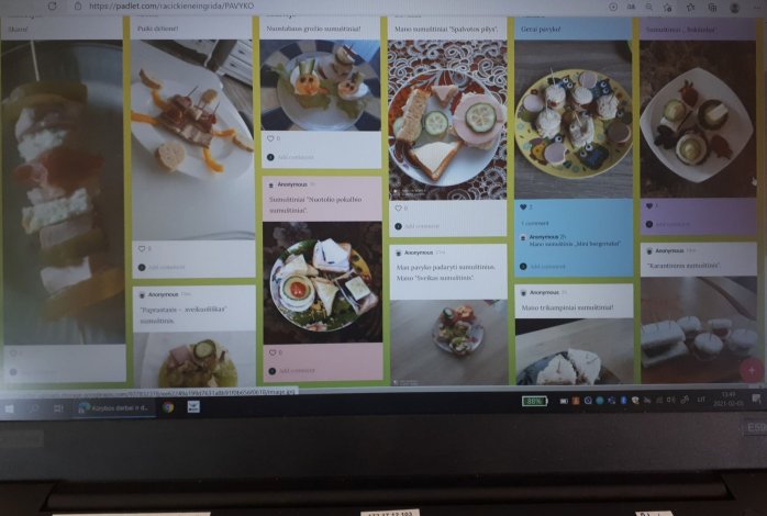 Norint jaukiai pasėdėti prie arbatos puodelio ir pasišnekučiuoti, kartais labai tinka ir nedidelis užkandis ar deserto gabalėlis. Todėl 2 a klasės mokiniai, besiruošdami socialinių įgūdžių valandėlei „Pokalbiai prie arbatos“, per integruotą matematikos ir technologijų pamoką „Geometrija virtuvėje“ pasigamino ne bet kokius, bet įvairių geometrinių figūrų sumuštinukus. Iš pradžių mokiniai pasigamino trikampio, kvadrato, skritulio, stačiakampio gretasienio formų trafaretus, vėliau, „išsilakstę po atskirus kambarius“, juos dėjo ant duonos, batono, sūrio, dešros, pjaustė ir formavo sumuštinukus. Iš likučių padarė sumuštinius – mozaikas, nes jau ankstesnių socialinių įgūdžių metu buvome išmokę, kad maisto išmesti negalima, reikia viską panaudoti.