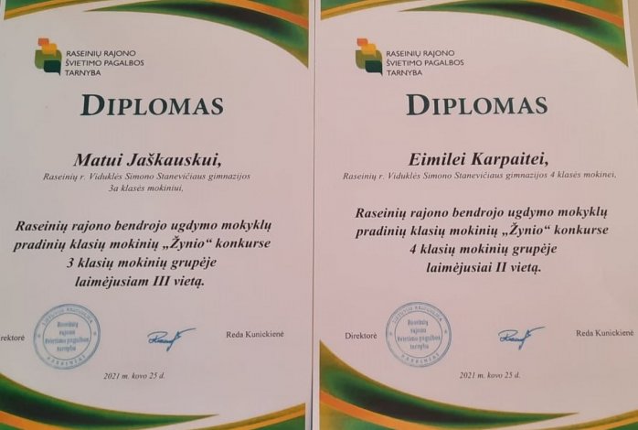 Kovo 25 d. gimnazijoje nuotoliniu būdu vyko Raseinių rajono bendrojo ugdymo mokyklų 3 – 4 klasių mokinių „Žynio“ konkursas, kurį organizavo Viduklės Simono Stanevičiaus gimnazijos pradinių klasių mokytojos: Edita Lukošienė, Raigeda Buzienė, Silva Vitauskienė ir Virginija Ralienė, Nemakščių M. Mažvydo gimnazijos pradinių klasių mokytoja. Konkurse dalyvavo net 75 mokiniai, susirinkę iš Raseinių Viktoro Petkaus pagrindinės mokyklos, Raseinių Šaltinio progimnazijos, Raseinių rajono Šiluvos, Betygalos Maironio, Nemakščių Martyno Mažvydo, Viduklės Simono Stanevičiaus gimnazijų. Mokiniai įgijo naujos patirties, žinių, visi siekė paties geriausio rezultato, tačiau prizinės vietos – tik trys. Džiaugiamės ir sveikiname mūsų gimnazijos mokinius: Matą Jaškauską, 3a klasės mokinį, trečiokų tarpe užėmusį III vietą ir Eimilę Karpaitę, 4b klasės mokinę, laimėjusią II vietą ketvirtokų tarpe.