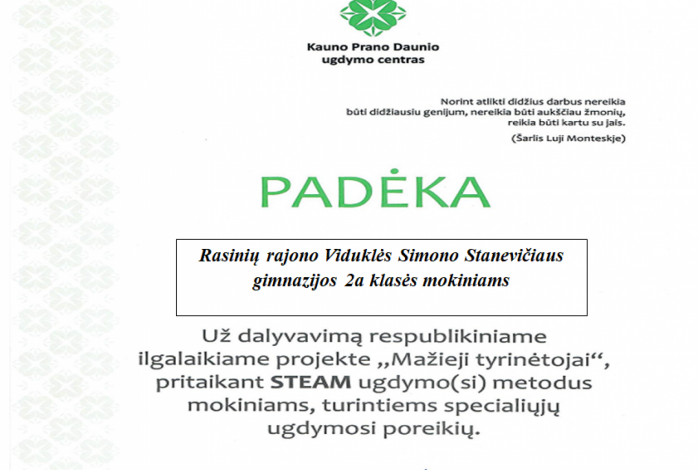 2a klasės mokiniai dalyvavo respublikiniame ilgalaikiame projekte „Mažieji tyrinėtojai”, ugdymo(si) STEAM metodų pritaikymas mokiniams, turintiems specialiųjų ugdymosi poreikių. Šio projekto tikslas – skatinti vaikų, turinčių specialiųjų ugdymosi poreikių, domėjimąsi juos supančia gyvąja gamta bei aplinka, formuoti mokinių pažinimo, kūrybiškumo, socialumo ir mokymosi mokytis kompetencijas, plėtoti vaikų užimtumą, tenkinti jų saviraiškos poreikius. Nuo mokslo metų pradžios stebėjome, tyrinėjome, eksperimentavome ir dalinomės savo projektais. Kviečiame pasižiūrėti įdomiausių veiklų filmuką, kuriame yra ir mūsų gimnazijos antrokėlių darbai https://youtu.be/HBhJtjuGVTQ.