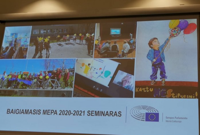 Rugpjūčio 26 d. Vilniuje oficialiai pasibaigė 2020-2021 mokslo metų projekto „Mokyklos - Europos Parlamento ambasadorės“ sezonas. Baigiamajame seminare susirinkę respublikos mokytojai diskutavo su Europos Parlamento nare Rasa Jukneviciene, sužinojo apie Konferencijai dėl Europos ateities skirtą pamoką ir ją išbandė gyvai susitikimo metu. Sėkmingas bei naudingas mūsų jaunųjų ambasadorių veiklas gimnazijoje patvirtina ketvirtus metus iš eilės gaunamas įrodymas - MEPA statusą patvirtinanti lentelė. Nuo spalio mėnesio gimnazijoje pradedamas naujas MEPA projekto įgyvendinimo etapas. Kūrybiškumo bei naujų idėjų lai netrūksta!
