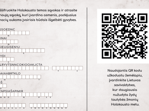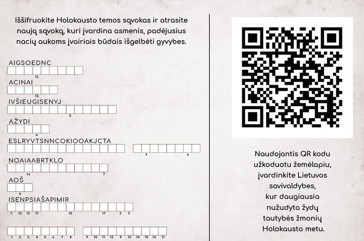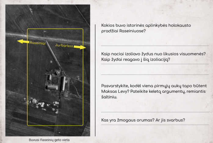 Tai citatos iš gimnazistų komandos vykdyto projekto „Dingusio gyvenimo pėdsakais – Raseinių žydai“, kurį finansavo JAV TOLI institutas. Dažnai istorijoje įvykusios tragedijos atgyja tik įsimintinų dienų metu. Siekiant gilesnio istorinės atminties poveikio, projekto įgyvendinimo metu mokiniai rinko informaciją apie Raseinių krašto žydus, rengė įtraukiančias užduotis, susijusias su krašto Holokausto istorija. Šiandien, rugsėjo 23 d., minint Lietuvos žydų genocido dieną, bendruomenė turi sukurtą metodinę priemonę - atvirlaiškių komplektą, skirtą susipažinti su Holokausto istorija ir to meto įvykiais Raseinių krašte. Gimtojo krašto tyrinėjimas ir istorinių pėdsakų atpažinimas jaunajai kartai ypač svarbus. Šiandien prisimename, rytoj patiriame. Penktadienį gimnazijos bendruomenė rengia žygį – „Kai eini į nežinią su viltimi...“, paminint gimtojo krašto genocido aukas.