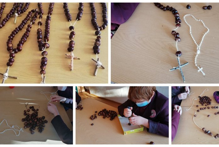Spalio 25 d. vyko integruota tikybos ir technologijų veikla 6a klasėje. Jos metu mokiniai vėrė iš kaštonų rožinį. Mokiniai pamokos pradžioje su tikybos mokytoja kalbėjosi apie rožinio maldos prasmę. Rožinis arba rožančius - skirtas apmąstyti Kristaus ir Marijos svarbiausius gyvenimo įvykius. Kalbant rožančių, naudojamas karoliukų vėrinys su kryželiu. Suverti tokį vėrinį, iliustruojantį rožančių, ir buvo pamokos uždavinys.