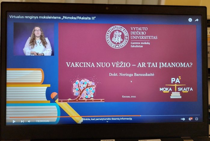 2021-11-26, mūsų gimnazijos mokiniai turėjo puikią galimybę stebėti VDU organizuotą mokslinių paskaitų ciklą. Dalyvavo Ib ir 6a klasės, pasirinkusios išklausyti paskaitą „Vakcina nuo vėžio-ar tai įmanoma?“ (lektorė VDU doktorantė Neringa Barauskaitė). Paskaita tapo pamoka. Ib klasėje vyko integruota biologijos-lietuvių kalbos pamoka (mokytojos Renata ir Virginija), o 6a klasėje – gamtamokslinė pamoka. Ib klasės mokiniai pamokos metu gavo integruotą biologinę-lietuvių kalbos, 6a klasė gamtamokslinę užduotį, susijusią su paskaitos turiniu. Džiugu tai, kad mokslinio lygio paskaita mokiniams buvo suprantama. Jai pasibaigus, išklausyta medžiaga buvo aptarta ir atsakyta į klausimą: vakcina nuo vėžio-ar tai įmanoma? Mokiniai suprato, kas yra vakcina, kaip atsiranda vėžinės ląstelės, kaip jos atrodo, kaip reaguoja imuninė sistema, kaip gydoma vėžinė liga.