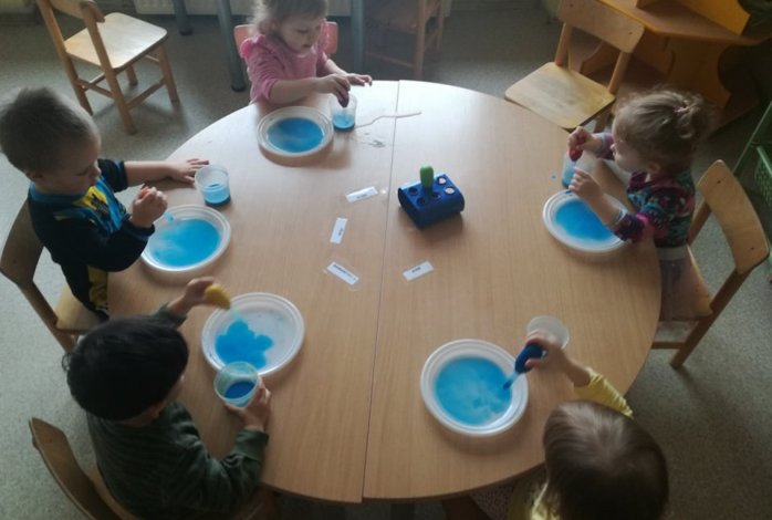 Patys mažiausieji ikimokyklinio ugdymo skyriaus „Nykštukų“ grupės vaikai pastebėjo, kad sparčiai vėsta orai, kaupiasi rudeniniai debesys ir jiems kilo daug klausimų. Kad atsakytų į šiuos klausimus, pedagogės organizavo STEAM veiklas ir su vaikais atliko bandymus: į vandenį pipetėmis lašino mėlyną vandenį, stebėjo kaip vanduo nusidažo mėlynai, kaip kyla burbulai kuomet įlašini muilo ir su pipete pasidarbuoji, o galiausiai su mėlynais burbulais pabandė nupiešti debesėlius. Dar vieną debesėlį visi kartu sukūrė iš mėlyno maišelio, į kurį pripūtė oro ir leido jam skrajoti. Mažiesiems labai patiko bandymai ir maži atradimai.