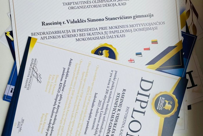 Praėjusią savaitę gimnaziją pasiekė tarptautinės KINGS olimpiados diplomai ir padėkos. Olimpiados organizatoriai dėkoja už aktyvumą ir džiaugiasi, kad Viduklės Simono Stanevičiaus gimnazija yra viena iš 200 aktyviausių Lietuvos mokyklų KINGS olimpiadų 2021 rudens semestre.