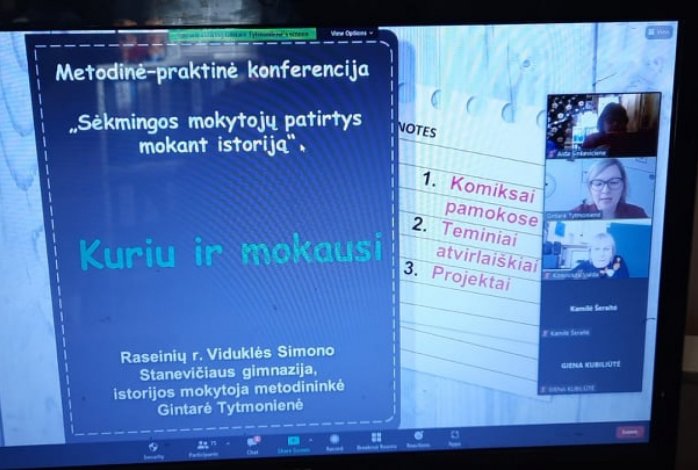 Vasario 15 d. gimnazijos istorijos mokytoja G. Tytmonienė skaitė pranešimą „Kuriu ir mokausi“ respublikinėje istorijos mokytojų metodinėje-praktinėje konferencijoje „Sėkmingos patirtys mokant istoriją , pilietiškumo pagrindus“. Pranešime mokytoja akcentavo komiksų naudojimo privalumus dalykų pamokose, pasidalino sukurtos metodinės priemonės – atvirlaiškių metodikos nauda bei pristatė trumpalaikius ir ilgalaikius mokinių projektus. Pamokose kurti komiksai – puikus mokymosi šaltinis, kuris nenusileidžia vadovėlio medžiagai. Komiksai istorijos ir pilietiškumo pamokose atvėrė kelia savivaldžiam mokymuisi.
