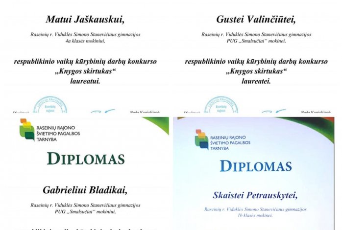 Priešmokyklinio ugdymo grupių vaikams ir pradinių klasių mokiniams nusišypsojo laimė respublikiniame vaikų kūrybinių darbų konkurse „Knygos skirtukas". Net keturi mūsų gimnazijos vaikai tapo laureatais: priešmokyklinio ugdymo grupės ,,Smalsučiai" vaikai Gustė Valinčiūtė ir Gabrielius Bladika, 1b klasės mokinė Skaistė Petrauskytė ir 4a klasės mokinys Matas Jaškauskas. Džiaugiamės ir linkime toliau džiuginti mus savo darbeliais.