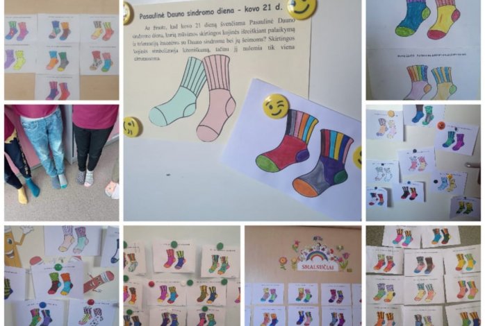 Kovo 21 d., minint Pasaulinę Dauno sindromo dieną ir išreiškiant palaikymą bei toleranciją Dauno sindromą turintiems žmonėms, visame pasaulyje mūvimos skirtingos kojinės, simbolizuojančios kitoniškumą. Šią diena mūsų gimnazijoje mūvinčių skirtingas kojines buvo ir be išankstinio planavimo ar akcijos skelbimo. Džiugu, kad šeimų, suprantančių kitokius ir palaikančių, tikrai turime. O pačioje gimnazijoje gausybė spalvotų ir linksmai skirtingų kojinaičių porų buvo pripiešta ant popieriaus.
