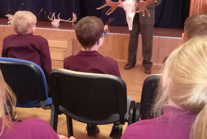 Pradinių klasių mokiniai susitiko su Raseinių Medžiotojų ir žvejų draugijos atstovais Antanu Kilčausku ir Dariumi Gružu. Susitikimo metu mokiniai sužinojo apie Lietuvoje ir mūsų rajone sutinkamus laukinius žvėris ir paukščius, jų populiacijos dydį. Išsiaiškino, kad stumbras – stambiausias dabartinis Europos laukinis žvėris, mūsų rajono miškuose negyvena, tačiau dažnai galime sutikti draugiškai nusiteikusį briedį. Antanas Kilčauskas mokiniams papasakojo, kada žvėrys poruojasi, atsiveda jauniklius, meta ragus, kas ir kada iš laukinių žvėrių gali būti pavojingi žmogui. Mokiniai susidomėję klausėsi pasakojimo apie medžioklę, kokius gyvūnus ir kada galima medžioti, o kokių – negalima. Visiems didžiulį įspūdį paliko briedžių, tauriųjų elnių ir stirnų ragai. Daugelis mokinių pirmą kartą pamatė šerno iltis. Dėkojame už įdomų susitikimą.