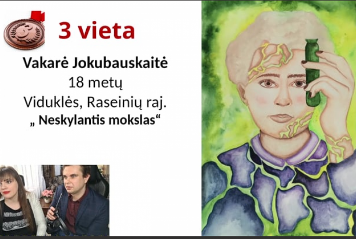 Nuo vasario mėnesio vyko respublikinis „Pasaulio kvantinės dienos Lietuvoje meno konkursas“, skirtas kvantiniams efektams ir įtakingiausiems kvantinės mechanikos istorijoje mokslininkams iliustruoti. Komisijos vertinimui pristatyta apie 200 mokinių ir suaugusiųjų darbų iš visos Lietuvos. Konkurse dalyvavo IIIa klasės mokinė V. Jokubauskaitė, konkursui pateikusi mokslininkės Marijos Kiuri, kuri buvo radiologijos srities pradininkė, dukart Nobelio premijos laureatė, profilio piešinį. Vakarė 13-18 metų mokinių tarpe laimėjo III vietą ir buvo apdovanota specialiuoju prizu – Auksinio proto stalo žaidimu. Sveikiname Vakarę ir džiaugiamės jos sėkme.