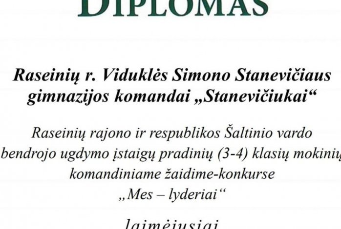 Šiandien vyko Raseinių rajono ir respublikos Šaltinio vardo bendrojo ugdymo įstaigų pradinių (3-4) klasių mokinių intelektualus komandinis žaidimas-konkursas ,,Mes – lyderiai“. Žaidime dalyvavo net 24 komandos iš įvairių Lietuvos mokyklų. Mūsų gimnazijos komanda ,,Stanevičiukai”: Tėja Meilytė, Viktoras Sabaliauskas, Meda Trakšelytė ir Matas Jaškauskas užėmė I vietą. Džiaugiamės ir sveikiname!