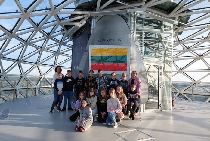 Nuotraukoje 5a klasės mokiniai Molėtų Etnokosmologijos muziejaus apžvalgos bokšte, virš jų Lietuvos trispalvė, kuri pabuvojo Mėnulyje. Tai išskirtinė Lietuvos vėliava.