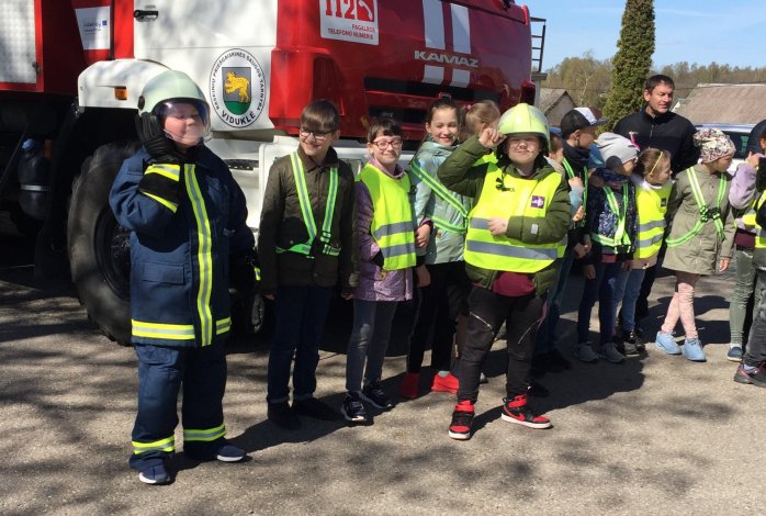 Šiandien 3b klasės mokiniai lankėsi Raseinių priešgaisrinės tarnybos Viduklės poskyryje. Pirmiausia mokiniai pasveikino ugniagesius gelbėtojus su profesine švente, palinkėjo jiems sėkmės gesinant gaisrus ir gelbėjant žmones. Vėliau vyko pokalbis su ugniagesiais gelbėtojais apie jų nelengvą profesiją. Žinoma, kad geriausia išvykos dalis - praktinė veikla. Mokiniai susipažino su technika, apranga, patys galėjo apsivilkti ugniagesio aprangą, įlipti į gaisrinės mašinos kabiną. Ši patirtis mokiniams labai patiko.