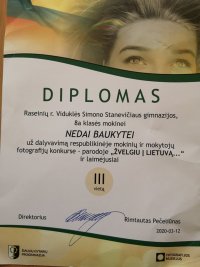Jau buvau rašiusi, jog penkių mūsų gimnazijos mokinių darbai dalyvavo Respublikinėje mokinių ir mokytojų fotografijų parodoje - konkurse „Žvelgiu į Lietuvą...“. O šiandien mus pasiekė puiki žinia, jog šiame konkurse 5-8 klasių mokinių tarpe 8a klasės mokinė Neda Baukytė užėmė III -ąją vietą! Sveikiname prizininkę ir džiaugiamės kartu!