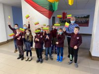Gimnazijoje visi, pradedant pačiais mažiausiais ikimokyklinukais ir baigiant „solidžiais“ abiturientais, gyvena artėjančios Vasario 16-osios šventės laukimu. Langai padabinti naujais karpiniais, sudėliotas šventinio žygio maršrutas, repetuojami šventiniai kūriniai. Šiandien mažieji pirmokai pasidžiaugė, kad jie jau pasiruošė šventei - išmoko himną ir pasigamino vėliavėles.
