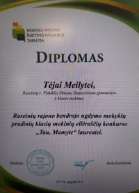 Gegužės pradžioje vyko Raseinių rajono bendrojo ugdymo mokyklų pradinių klasių mokinių eilėraščių konkursas „Tau, mamyte!“. Konkurso tikslas ir uždaviniai – paminėti Motinos dieną, ugdyti mokinių vertybines nuostatas, gebėjimą reikšti meilę, pagarbą ir dėkingumą artimam, skatinti mokinių kūrybinę raišką. Jame dalyvavo ir mūsų gimnazijos mokiniai. Sveikiname 3a klasės mokinę Tėją Meilytę, kuri tapo konkurso laureate.