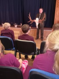 Pradinių klasių mokiniai susitiko su Raseinių Medžiotojų ir žvejų draugijos atstovais Antanu Kilčausku ir Dariumi Gružu. Susitikimo metu mokiniai sužinojo apie Lietuvoje ir mūsų rajone sutinkamus laukinius žvėris ir paukščius, jų populiacijos dydį. Išsiaiškino, kad stumbras – stambiausias dabartinis Europos laukinis žvėris, mūsų rajono miškuose negyvena, tačiau dažnai galime sutikti draugiškai nusiteikusį briedį.