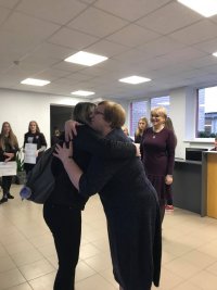 Kovo 18-osios rytą nuostabos ir šypsenų buvo pilni mokinių ir mokytojų veidai, nes nuo ankstyvo ryto visus prie durų pasitiko gimnazijos direktorė Danutė Janukienė ir atvykusius pasveikino apsikabinimais. Šiek tiek vėlėliau prie tokių pasisveikinimų prisidėjo pavaduotojos Audra Ir Jolanta, socialinė pedagogė Romena, sveikatos priežiūros specialistė Lina ir būrelis mokinių.